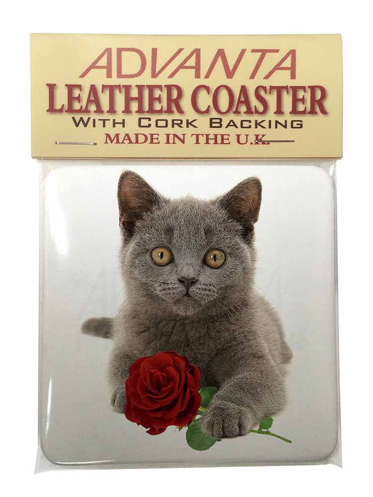 British Blue Kitten with Red Rose Single Leather Photo Coaster