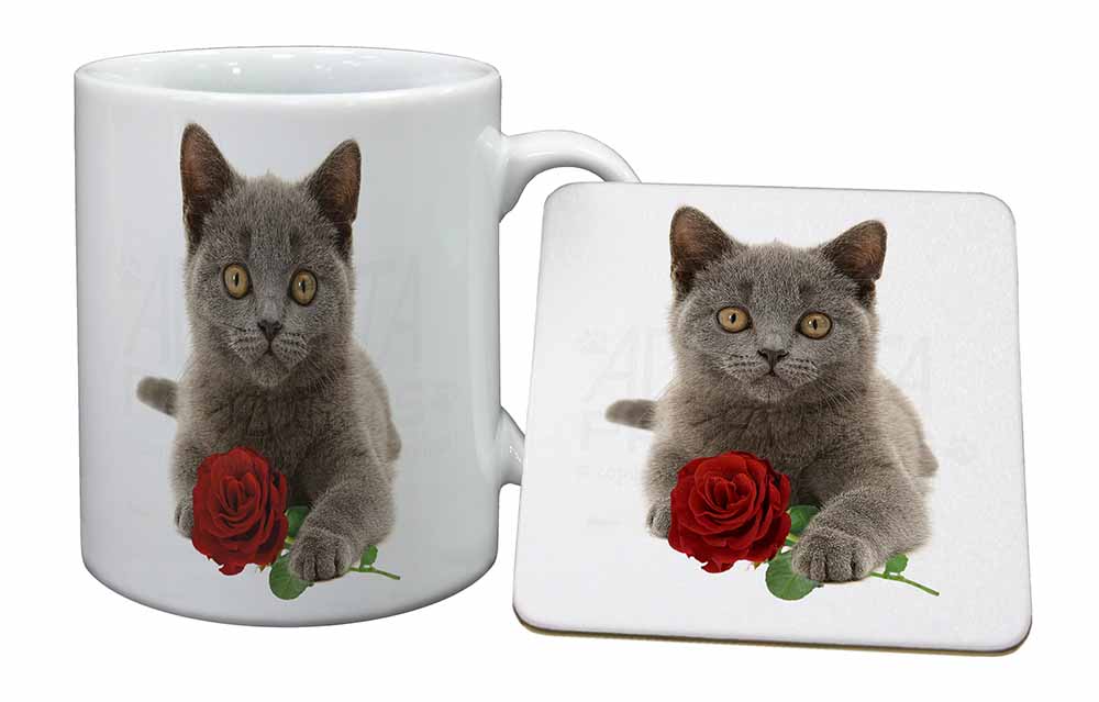 Design/Print: A Gorgeous British Blue Kitten with a Red Rose Between Paws...