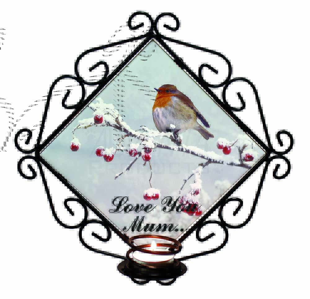 Snow Robin 'Love You Mum' Wrought Iron Wall Art Candle Holder