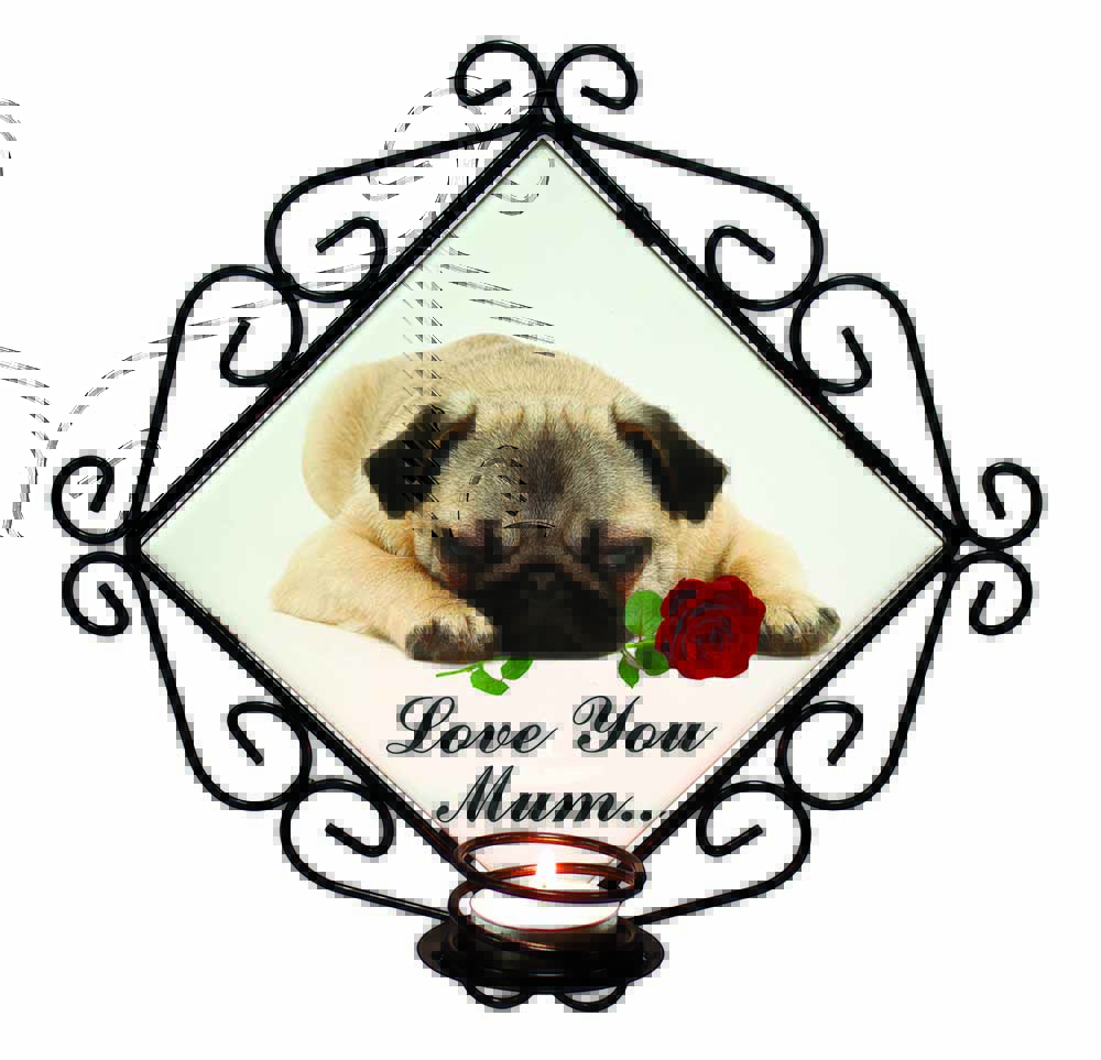 Fawn Pug with Rose 'Love You Mum' Wrought Iron Wall Art Candle Holder