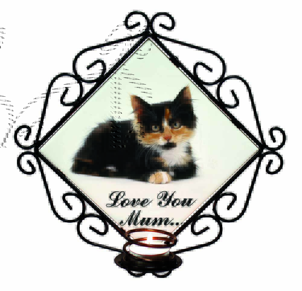 Cute Tortie Kitten 'Love You Mum' Wrought Iron Wall Art Candle Holder