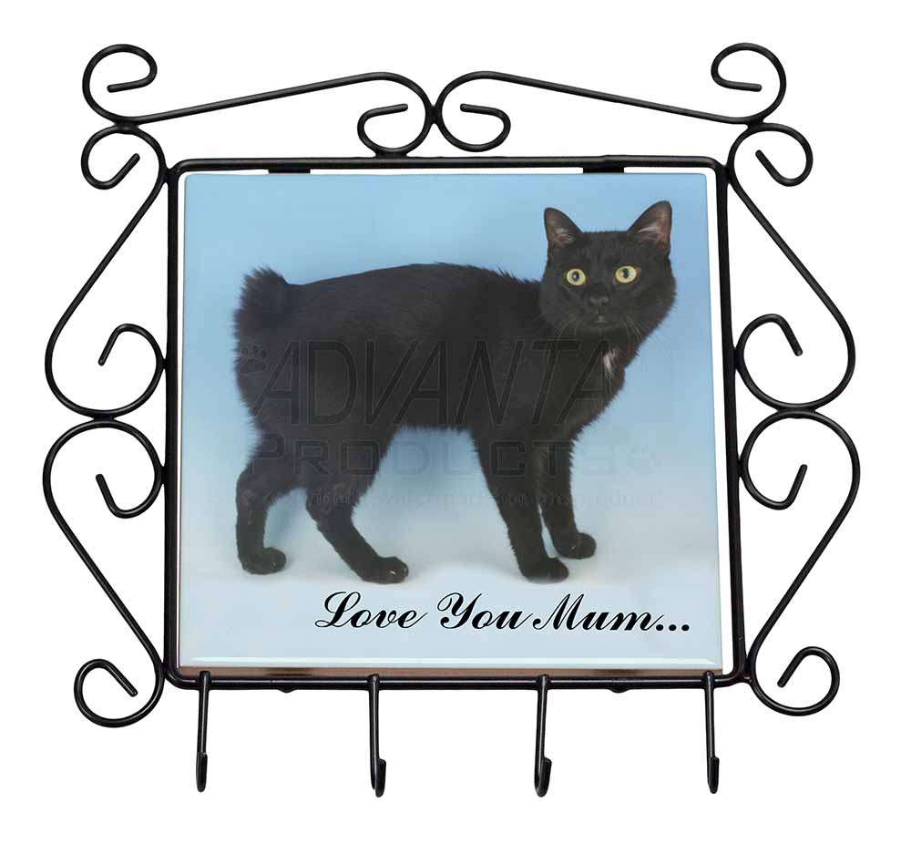 Black Bobtail Cat 'Love You Mum' Wrought Iron Key Holder Hooks