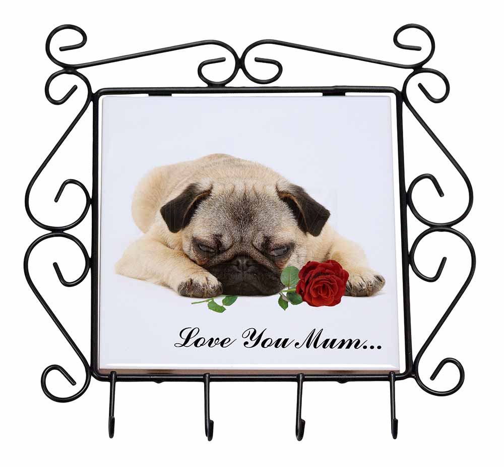 Fawn Pug with Rose 'Love You Mum' Wrought Iron Key Holder Hooks