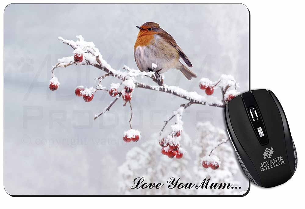 Design /Print: A Beautiful Winter Scene of a Robin Red Breast Sitting on a Snow Covered Red Berry Branch with the Wording 'Love You Mum'...
